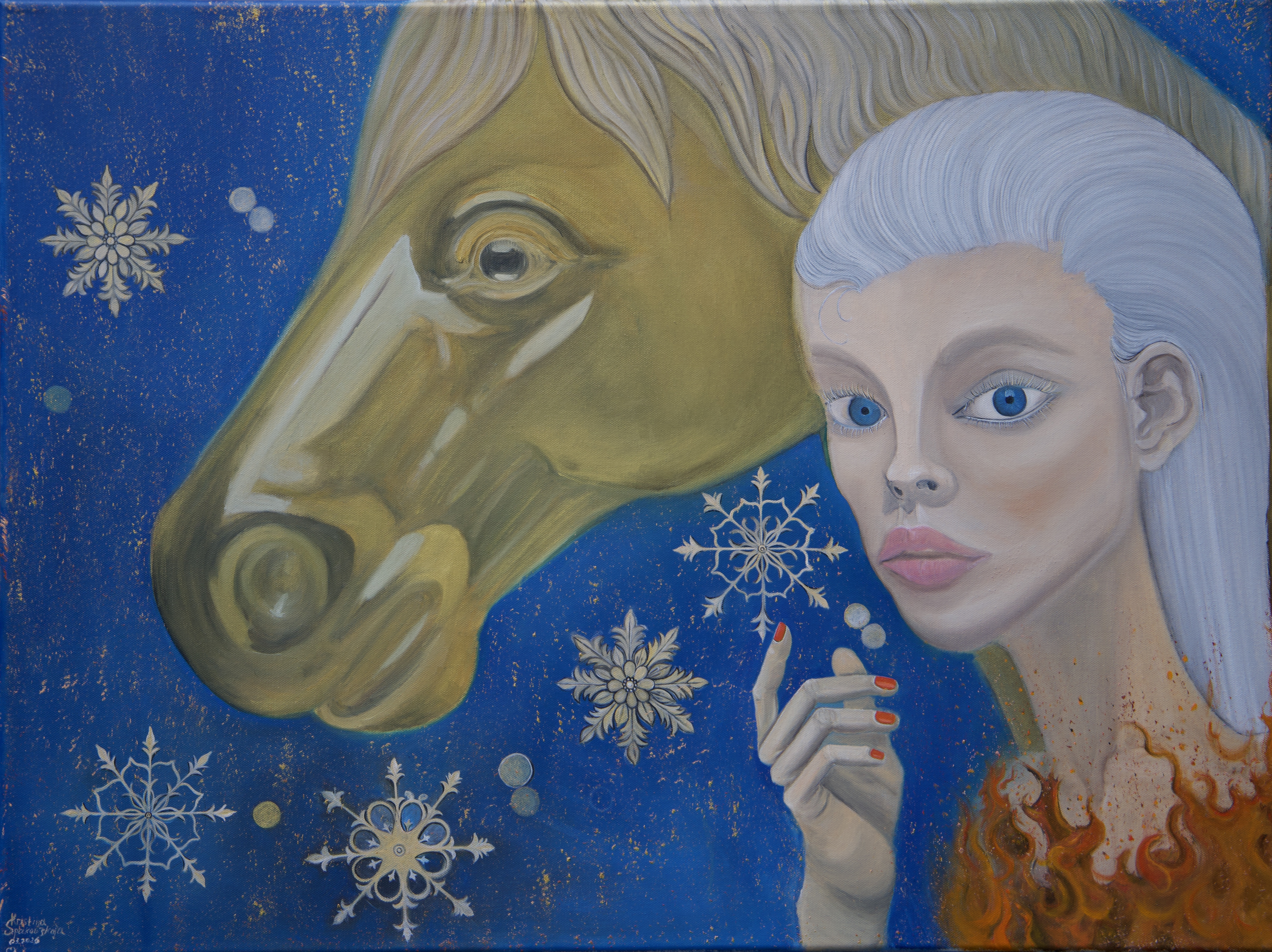 Kristina Spakowskaja verfolgt in ihrer Kunst eine faszinierende Mischung aus Größe, Mystik und kritischer Reflexion. Ihre Ölgemälde sind oft überdimensional und schaffen eine imposante Präsenz, die den Betrachter in eine andere Welt eintauchen lässt. Die Werke zeichnen sich durch lebendige, kräftige Farben aus, die eine beinahe surreale Atmosphäre erzeugen. Die Farben wirken manchmal popartig und tragen zu einem intensiven visuellen Erlebnis bei, das sowohl Freude als auch Nachdenklichkeit weckt. Die Stillrichtung von Spakowskaja ist vielseitig und bewegt sich zwischen Ernsthaftigkeit und Ironie. Oft lässt sie in ihren Gemälden subtile gesellschaftliche oder politische Botschaften durchscheinen, die den Betrachter zum Nachdenken anregen. Ihre Werke sind eine Mischung aus tiefgründiger Auseinandersetzung mit sozialen Themen und provokanten, humorvollen Elementen, die Gesellschaftskritik in einer scheinbar leichten, aber sehr durchdachten Weise formulieren. Ein charakteristisches Merkmal ihrer Kunst ist die Fähigkeit, mit Symbolik und Übertreibung zu spielen, wodurch sie die Grenzen zwischen Realität und Fantasie verschwimmen lässt. Ihre Werke sind oft mystisch und surreal, was dem Betrachter ermöglicht, eigene Interpretationen zu entwickeln. Spakowskaja nutzt ihre Ölgemälde, um sowohl die Schönheiten als auch die Herausforderungen der Welt zu kommentieren, wobei sie sich nicht scheut, gesellschaftliche Missstände, Normen oder Absurditäten humorvoll und provokativ anzugehen. Insgesamt verbindet Kristina Spakowskaja in ihrer Kunst die visuelle Opulenz und Farbigkeit des Pop-Art-Stils mit einer tiefgründigen, oft kritischen Auseinandersetzung mit der Welt, was ihre Werke sowohl ästhetisch ansprechend als auch intellektuell anregend macht.